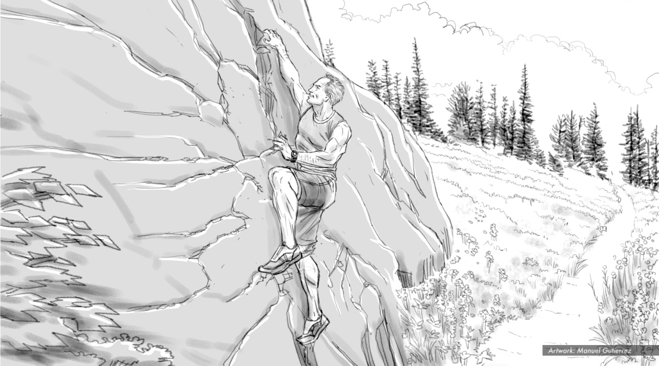 One A Day, climbing, BW storyboard frame – Energy BBDO